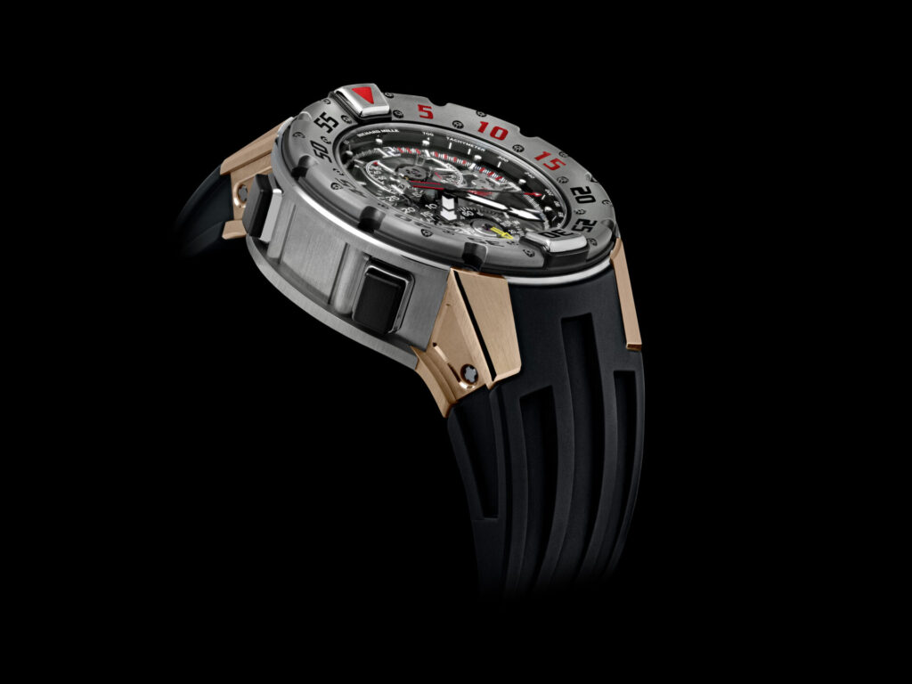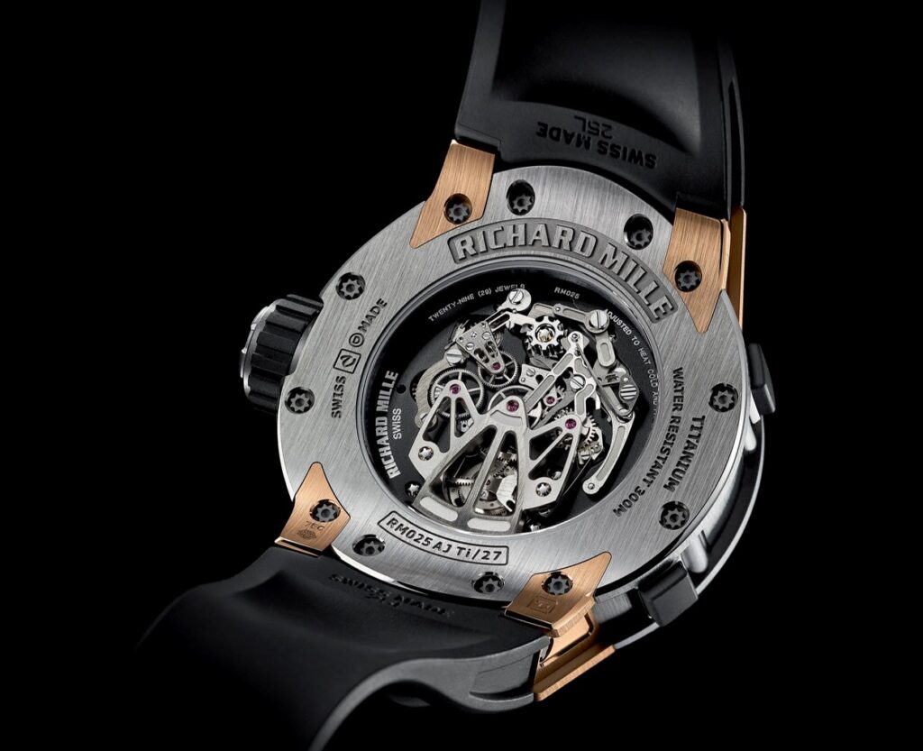 RM 025が歴史的傑作とされる最大の理由は、その内部機構にあります。ダイバーズウォッチという堅牢さが求められるカテゴリーにおいて、繊細極まる「トゥールビヨン」と、複雑機構の代表格である「クロノグラフ」を統合させたのです。