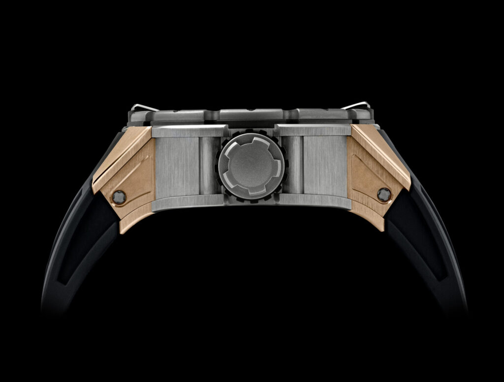 水深300m(30気圧)という過酷な環境下で完全な密閉性を維持するためには、均等な圧力がかかる円形の形状が最も適しています。RM 025のケースは、ベゼル、ミドルケース、ケースバックの3つの主要パーツから構成される複雑な三重構造を採用。