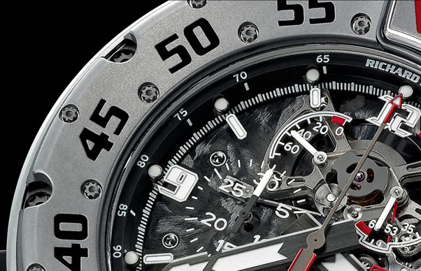 24本の特製トルクネジでケースに取り付けられた逆回転防止ベゼルは、特定の箇所を押しながらでないと回転しない仕組みです。また、ベゼルのシステム全体がケースにネジ止めされていることで安定性が確保され、ズレや緩みが生じることがなく、さらに暗闇の中での視認性を確保するため、12時のスタートから5分間隔の表示は、最初の15分だけ赤で強調するなど、極限状態での安全性を第一に考えるリシャール・ミルの哲学を象徴しています。