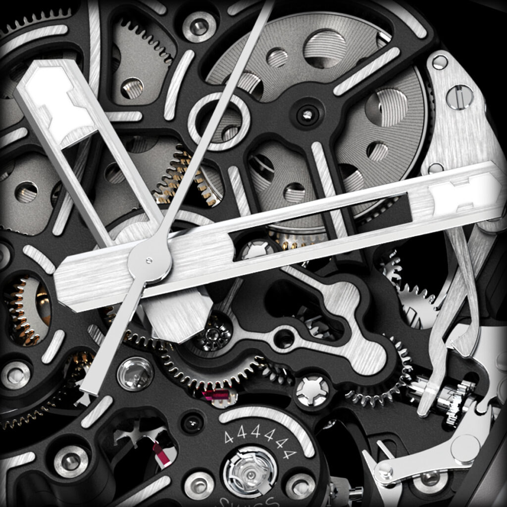 ムーブメントの構造には、グレード5チタンを用いたスケルトン加工の地板とブリッジが採用され、究極のスケルトン化が施され、極めて高い剛性と軽量性を確保しています。これにより、優れた耐久性と精度を実現。