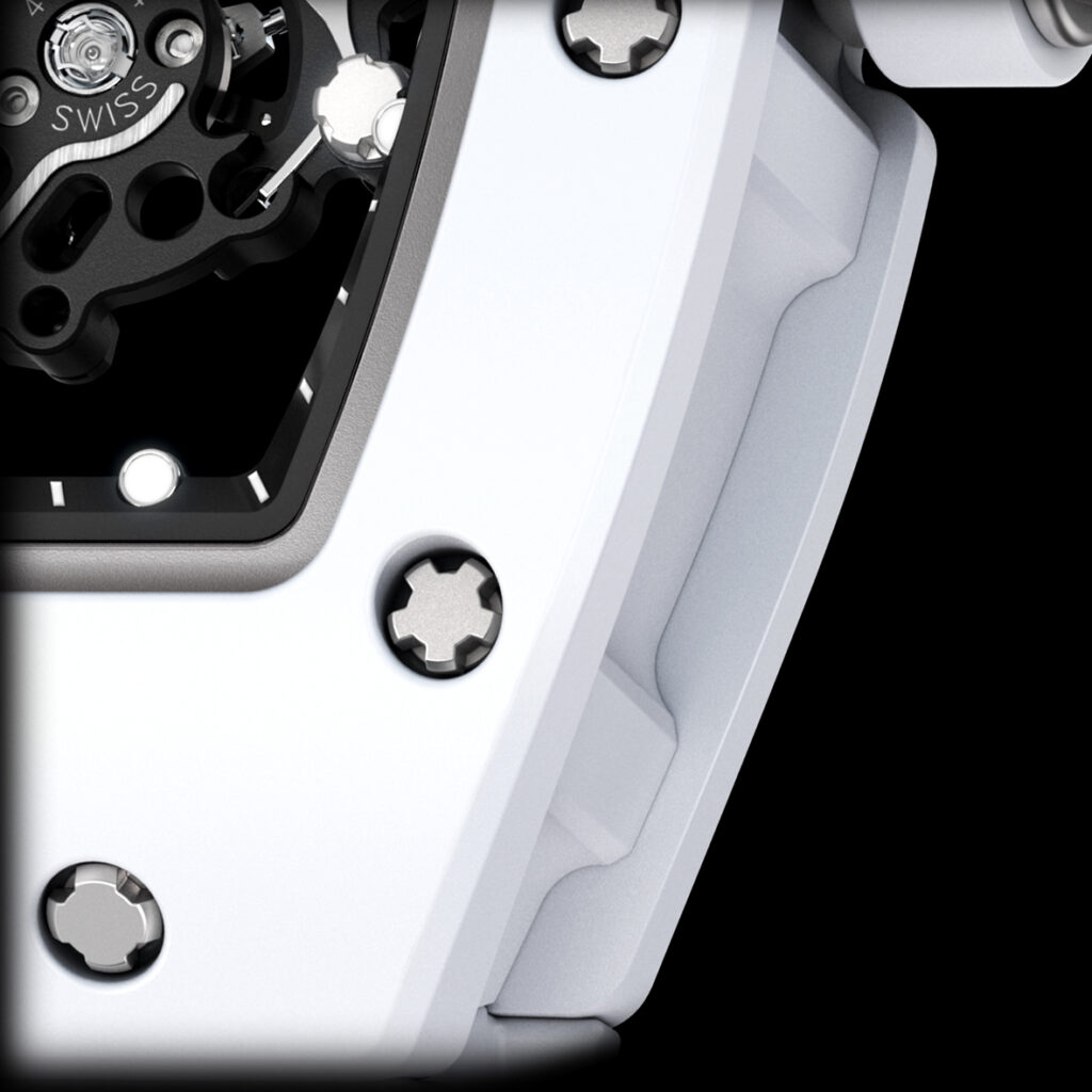 「RM 055 バッバ・ワトソン」のデザインは、プロアスリートのためのギアとしての機能美を追求しています。人間工学に基づいた曲線的なトノー型ケースは、手首の動きを妨げないよう、完璧なフィット感を実現するために設計されました。この複雑なカーブを持つケースの製造には、数多くの精密な加工工程が必要とされ、リシャール・ミルの卓越した技術力が惜しみなく投入されています。