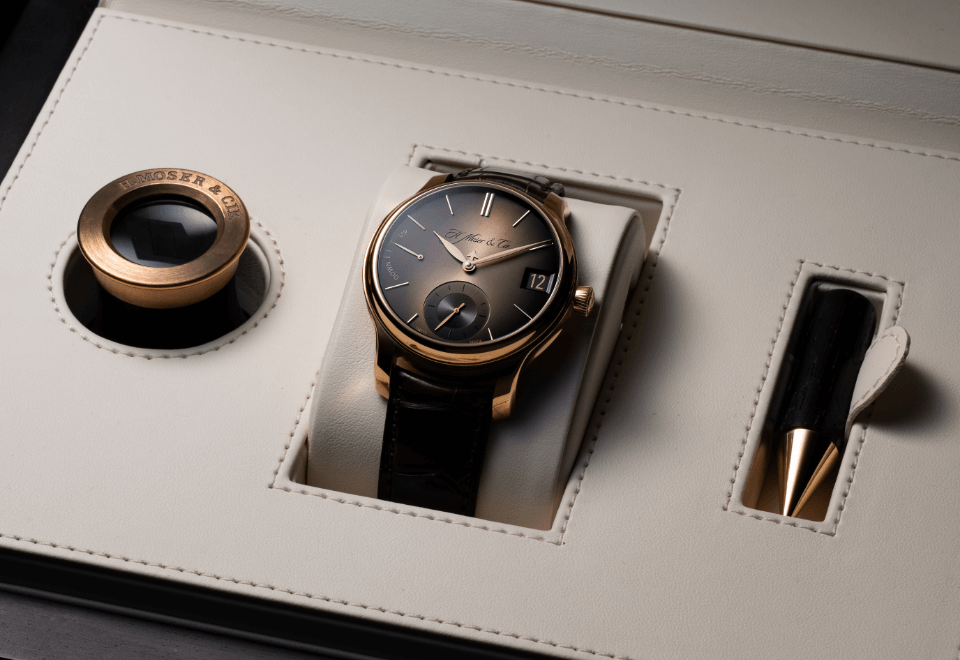 スイス・シャフハウゼンを拠点とし、アートのような優美な文字盤と時計の精度を司るヒゲゼンマイをはじめとする微小パーツさえも自社で製造する技術力が高く評価されているH.モーザー。
