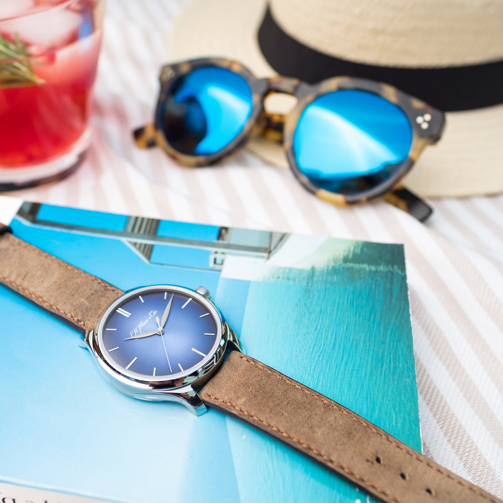柔らかく肌なじみのいい、クーズーストラップとの組み合わせはファンキーブルーの爽やかな表情を一層引き立たせています
