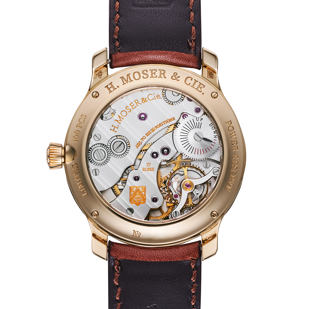 H.モーザーの再興以降、長きにわたり基幹ムーブメントであったHMC321。インジケーターもムーブメント側に備わっています。