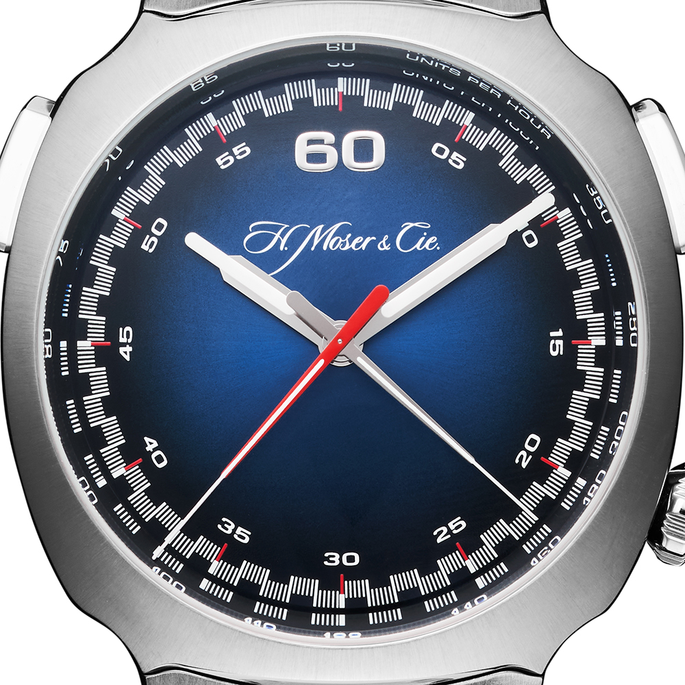 ファンキーブルー ダイアルの縁の外側にはレッドとホワイトの秒目盛り、内側には分目盛りが刻まれています。正午の位置には、60 の数字を配し、読み取りやすさと機能性が重視された 1960~70 年代のストップウォッチを思い起こさせます。