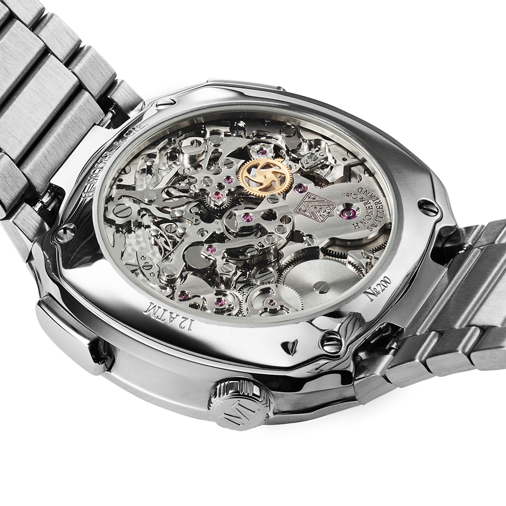 AGENHOR が H. モーザー社のチームと共同で開発したキャリバーを搭載。このムーブメントは非常に複雑な設計でありながら、シンプル、視認性、そしてミニマリズムを重視しつつ、センター表示で実用性および人間工学的な側面にも配慮がなされています。