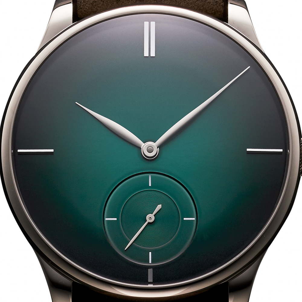 美しいフュメダイアルの奥行を最大限に味わうため、最小限のインデックスとブランドロゴも排したピュリティ・デザインが特徴です。コズミックグリーン仕様は世界限定50本の希少なモデルです。