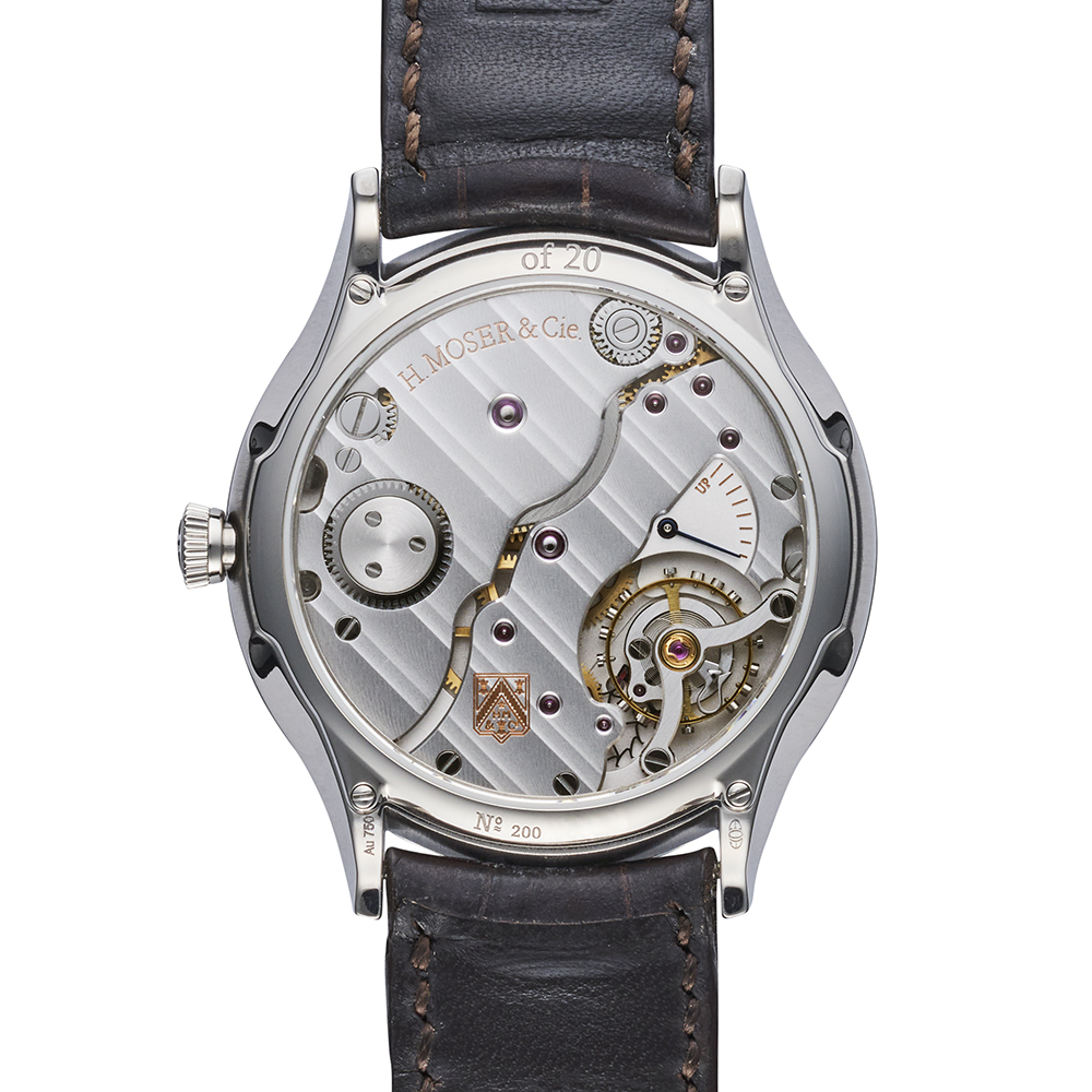 H.モーザーで自社開発したキャリバーHMC.327を搭載。美しい伝統的なモーザーストライプ装飾とH.モーザーとして初となるシリコン製のアンクルとガンギ車を採用した革新性が融合したムーブメントです。