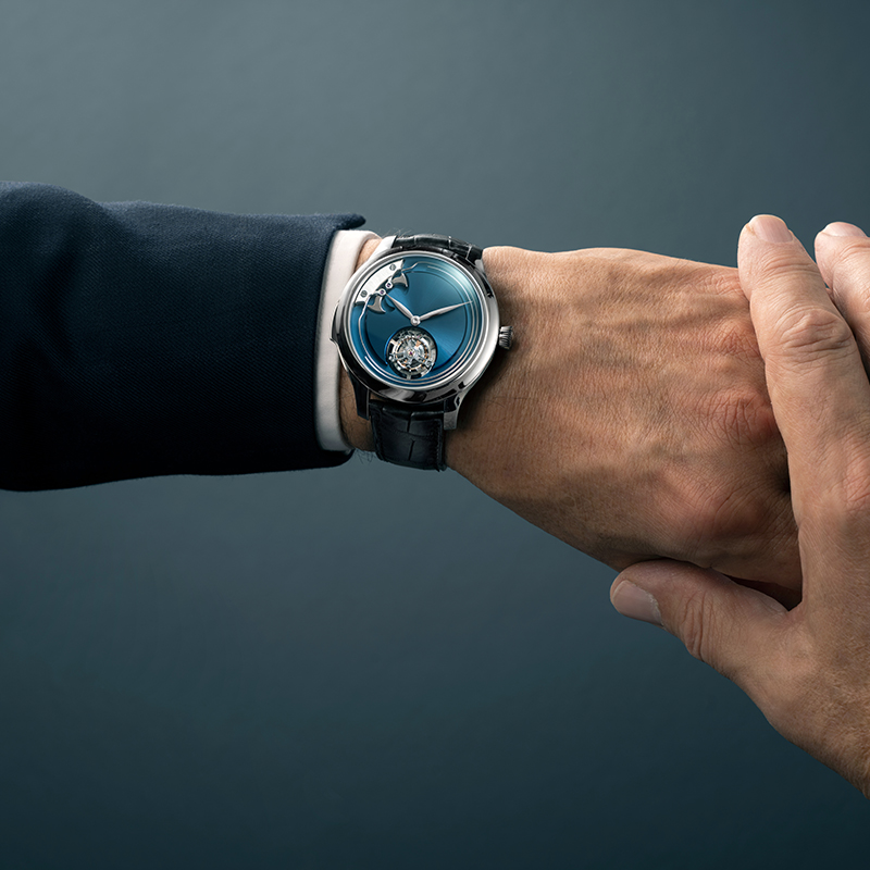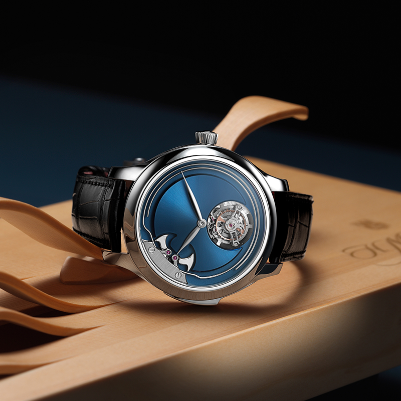 複雑機構のミニッツリピーターとトゥールビヨンを組み合わせ、音の伝搬速度に優れるチタン製のケースに搭載。通常ムーブメント側にあるリピータとゴングとハンマーをダイアル側に配置し、その動きと美しい音色を堪能することができます。