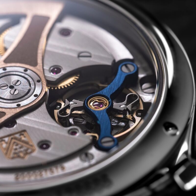 自社開発製造による自動巻きムーブメントのCal.HMC 200。ブルーのバランスブリッジが組み込まれ、オリジナルのシュトラウマン・ダブルヘアスプリングを搭載。