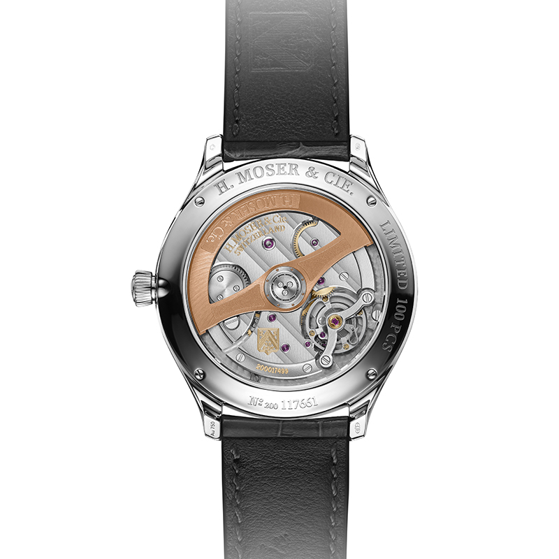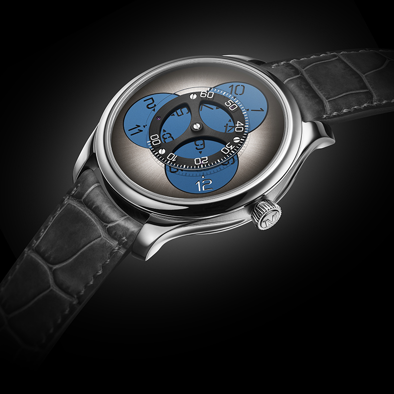 針の代わりに数字で時刻を示すアイディアを4枚のディスクを用いることで実現した個性的なタイムピース。伝統を尊重しつつ縛られないH.モーザーの姿勢を示す意欲作です。