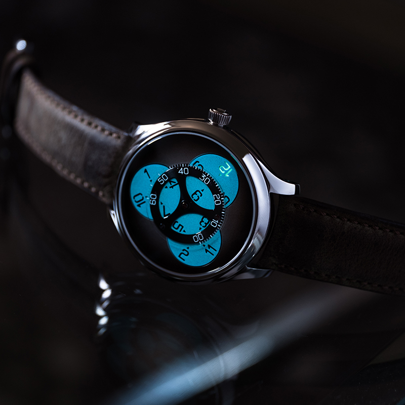時計回りに回転する分目盛が刻まれた透明なディスクと、その下にある3つのディスクの白く反転した数字が重なる部分で時刻を読み取る新しいコンプリケーション。