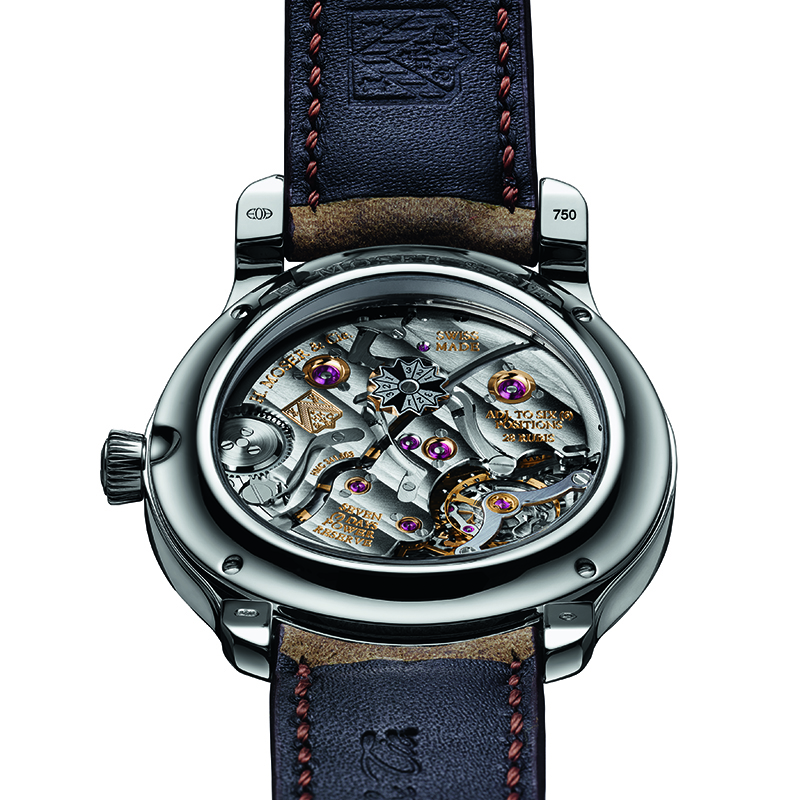 H.モーザーの自社開発製造によるHMC341を搭載。4年に一度の閏年表示はムーブメント側に設置されており、必要に応じて確認が可能。パワーリザーブインジケーターはダイアル側に設置されています。