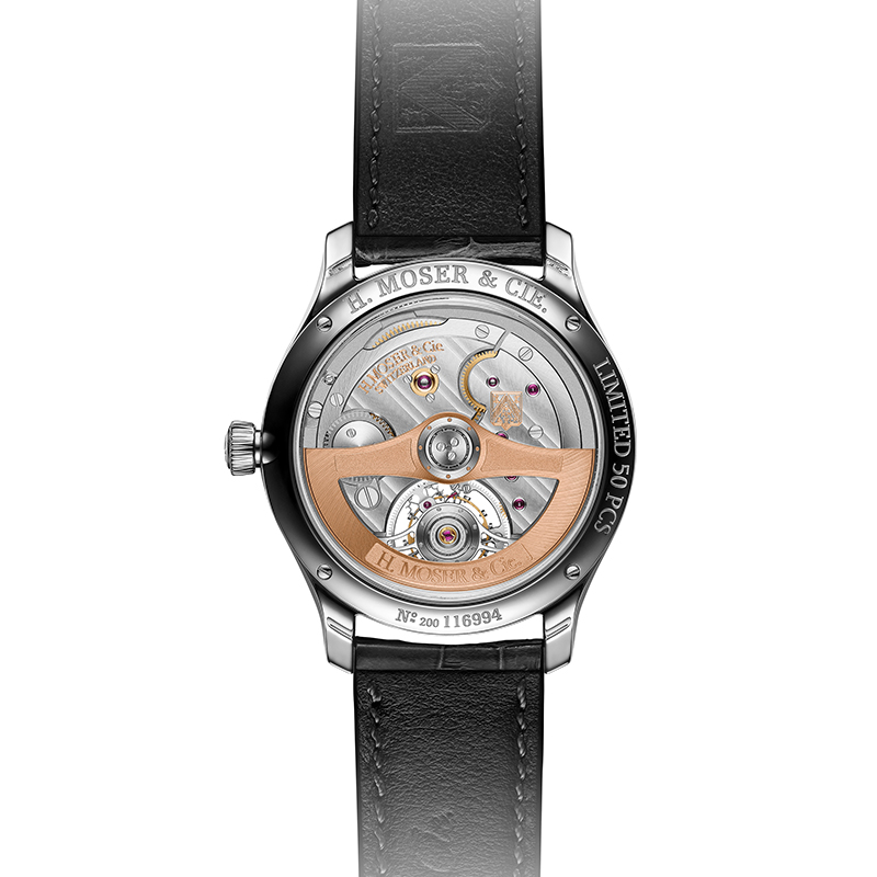 文字盤6時位置の開口部に見えるのがH.モーザーならではのモジュール式トゥールビヨン。この脱進器が60秒で1回転することで重力の影響を分散させて精度の安定化に貢献します。