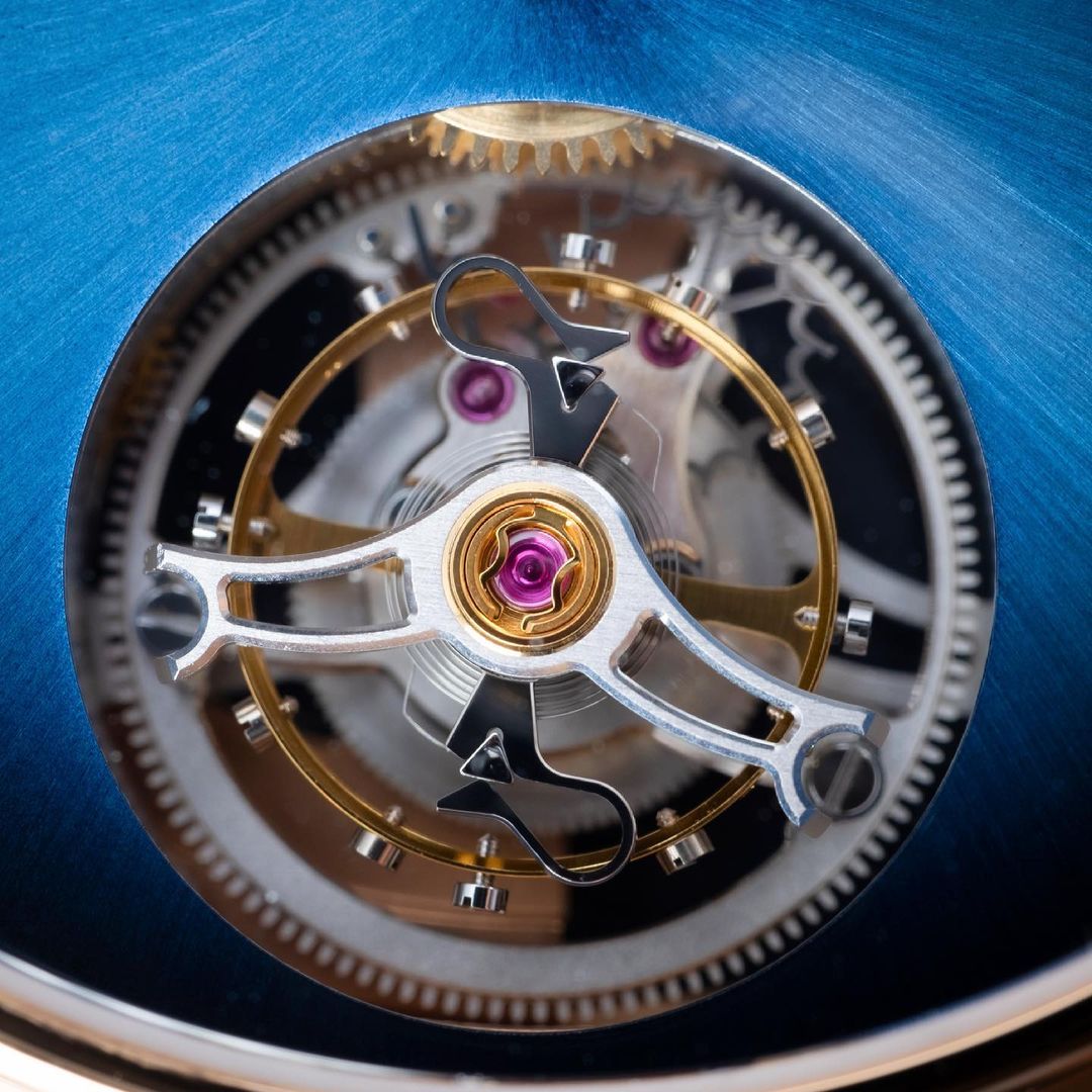 上面の支えを(ブリッジ)を持たず、あたかも宙に浮いたかのようなキャリッジが60秒で1回転するフライングトゥールビヨンを搭載。