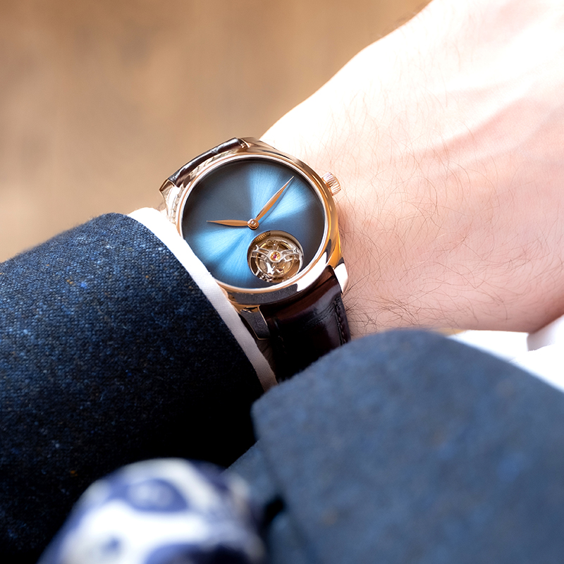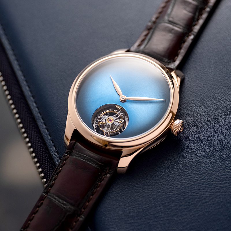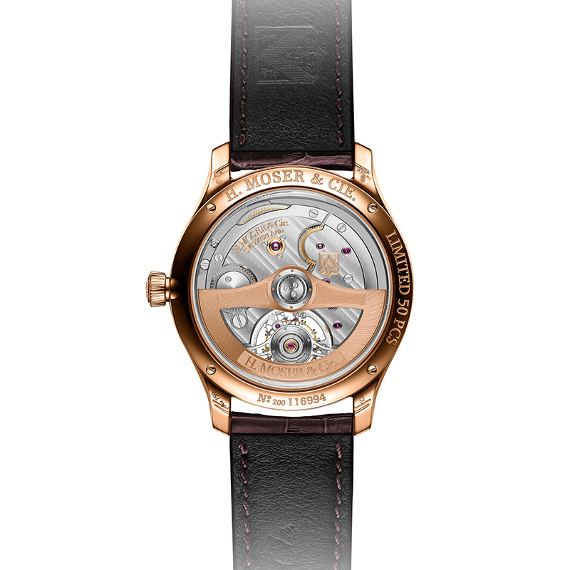 文字盤6時位置の開口部に見えるのがH.モーザーならではのモジュール式トゥールビヨン。この脱進器が60秒で1回転することで重力の影響を分散させて精度の安定化に貢献します。