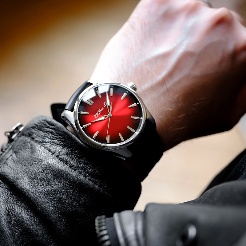 一瞬で目を奪われる鮮烈な赤いフュメダイアルは、SWISS MADEの規定の曖昧さに意見を投げかけた、2017年発表のスイスマッドウォッチから由来しています。