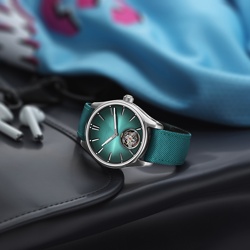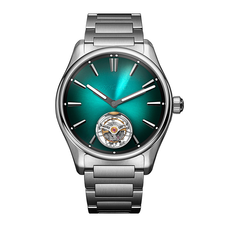 上面の支えを(ブリッジ)を持たず、あたかも宙に浮いたかのようなキャリッジが60秒で1回転するフライングトゥールビヨンを搭載。、H.モーザー独自のダブルヘアスプリングを組み込み、より高い精度安定性を実現しました。