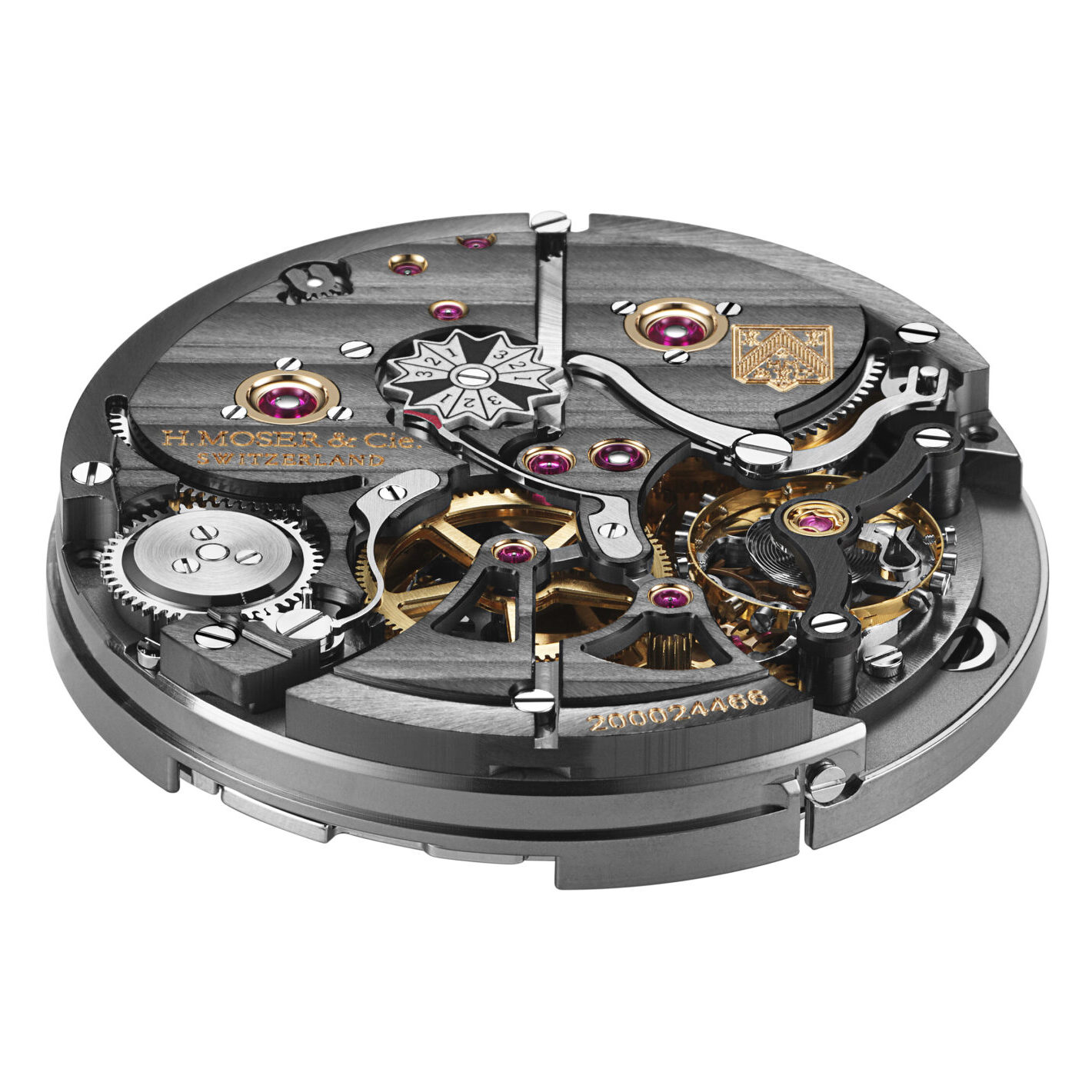 新たにセンターセコンド仕様に再設計された自社製キャリバーHMC812。文字盤からケース、ブレスレットとのトーンを合わせるためにムーブメント全体にアンスラサイトグレーのPVDコーティングが施されています。