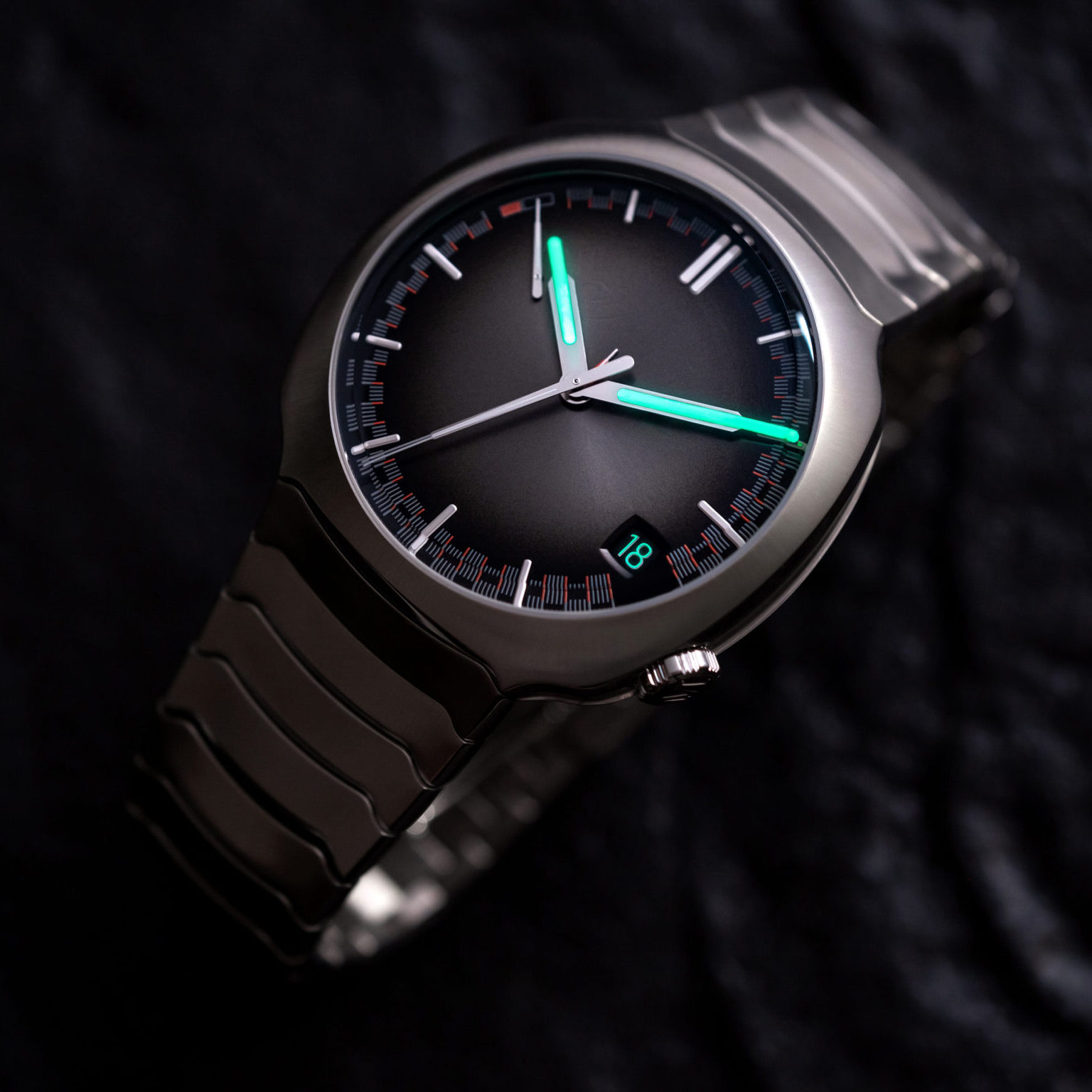 H.モーザーのロゴはクリアラッカーで塗装され、見る角度によってはロゴが無いように見えます。また針は蓄光塗料を配合したセラミック化合物であるグロボライト®製で暗所でも高い視認性を誇ります。