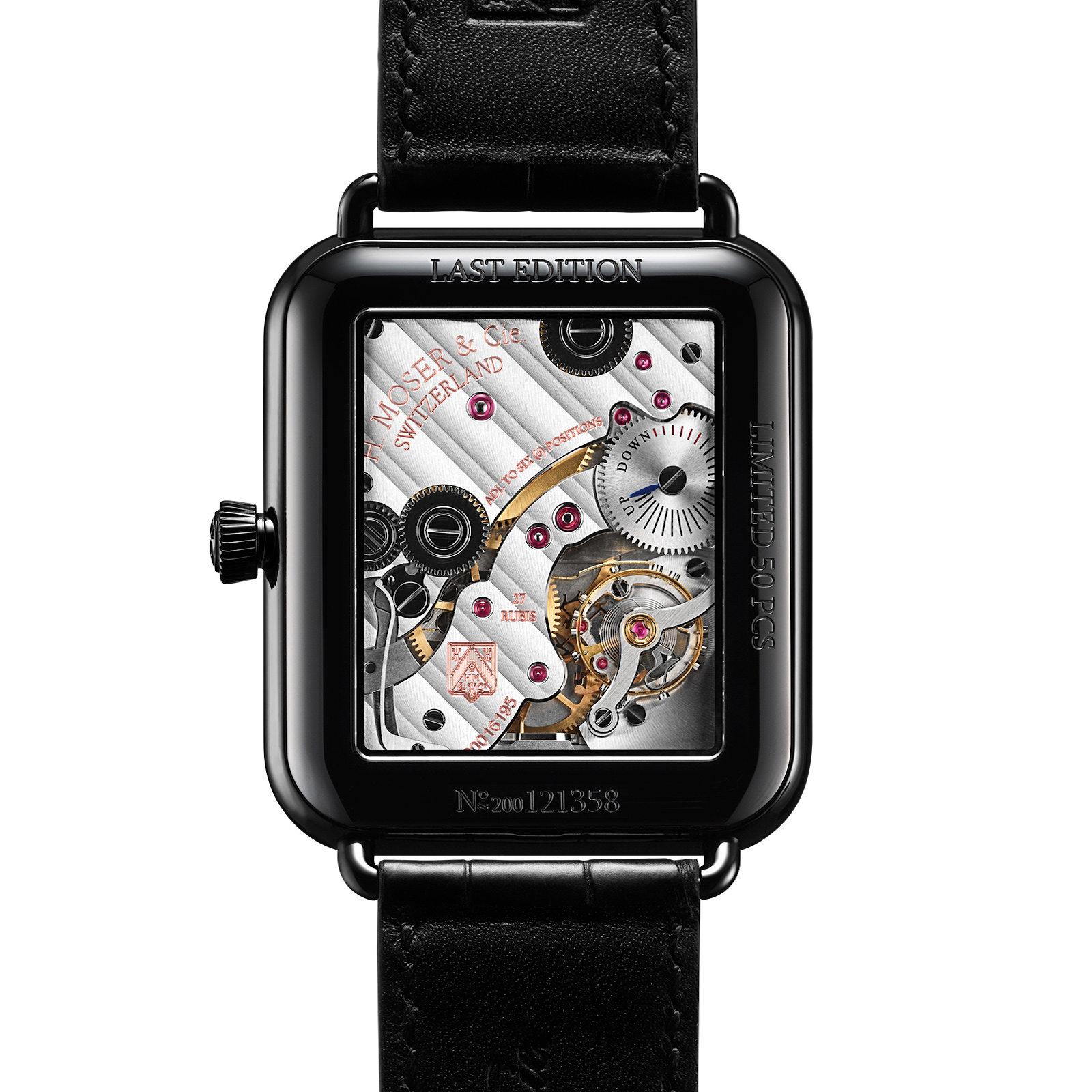 | 機能・特徴 | ブラックのリーフ型の時針、分針 6 時位置のスモールセコンド サファイアクリスタル風防 ブラック アリゲーター レザーストラップ |