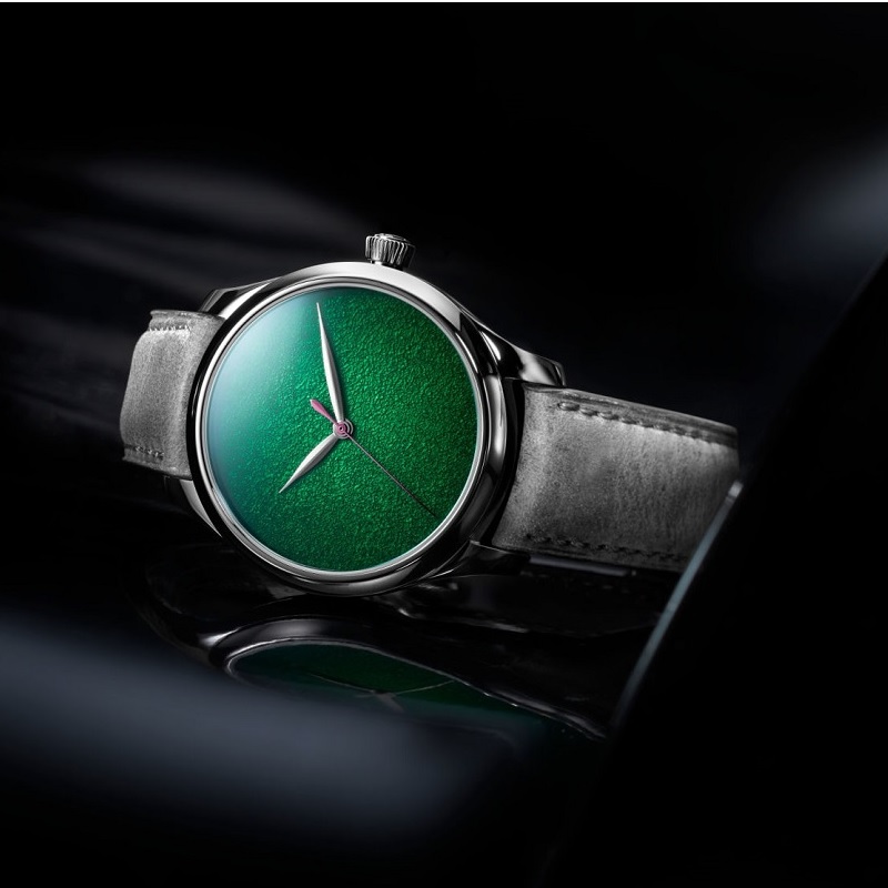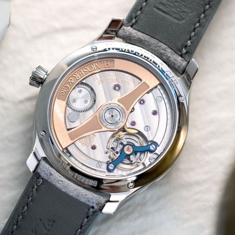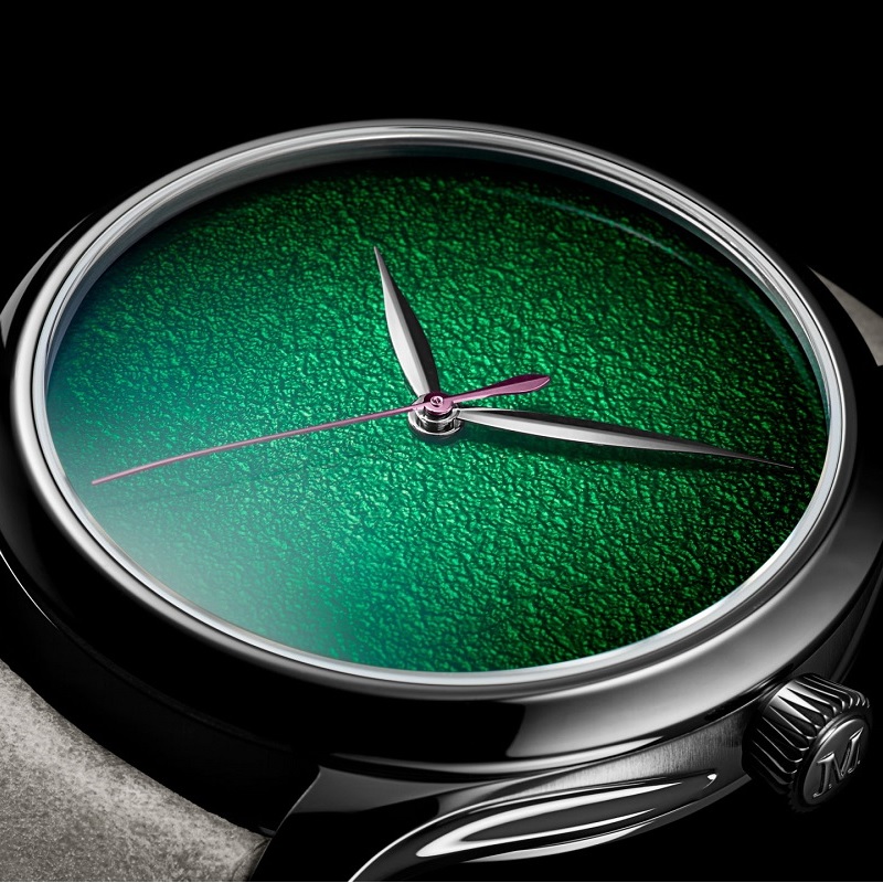 文字盤からロゴもインデックスも取り除いたH.モーザーを象徴するコンセプトデザインに、槌目仕上げを施したグランフー・エナメルのフェメダイアルが静謐なエレガンスに力強さを添えます。