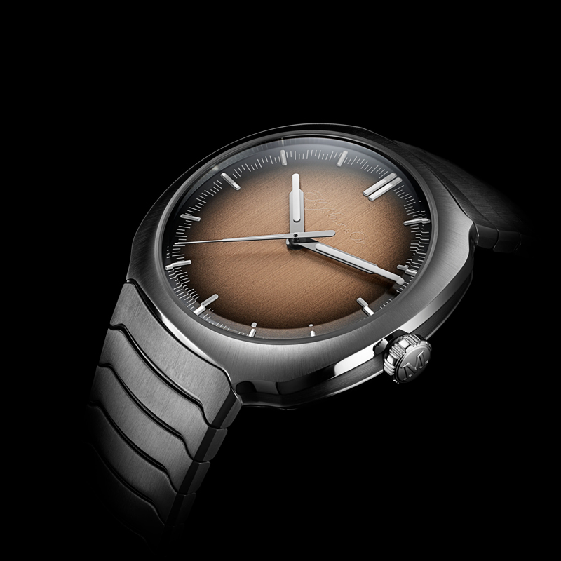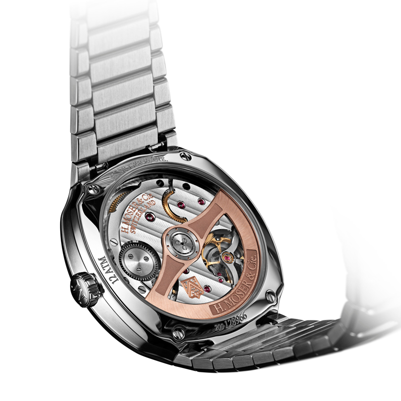 金属の美しい質感と流れるようなラインが特徴で、H.モーザーが5年の歳月を掛けて完成させたケースとブレスレットには、随所にその特徴と人間工学に基づいた形状を反映させています。