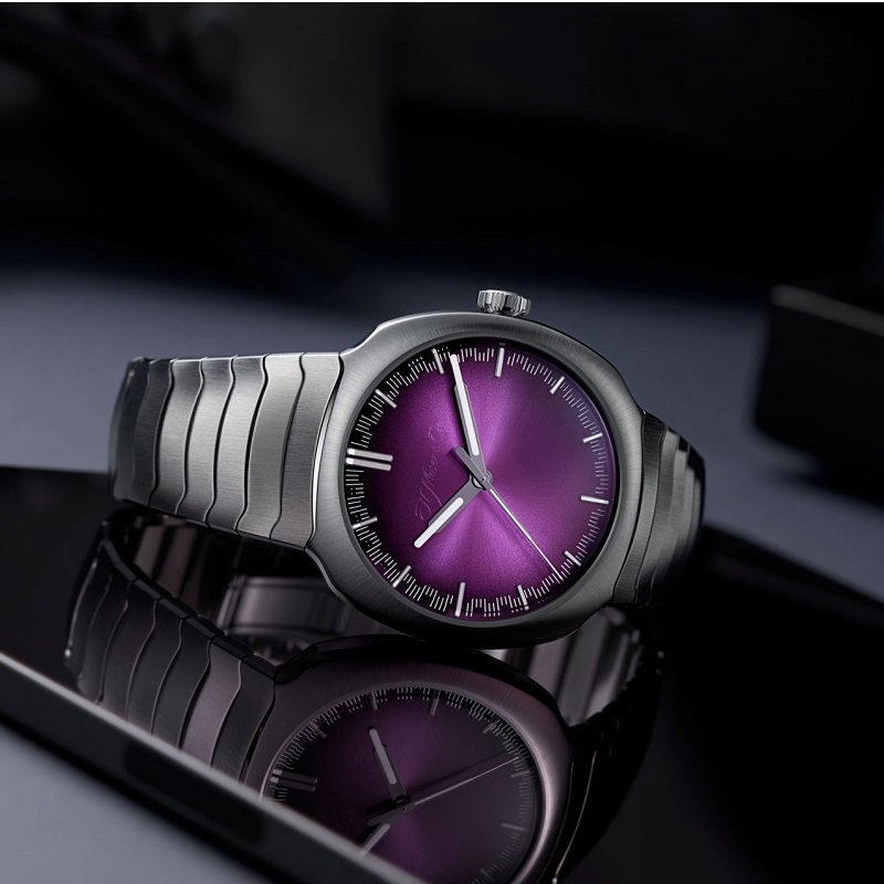 サンバースト仕上げを施したパープルヘイズのフュメダイアルは、クリアラッカー仕上げのロゴと、クラシックの定番である 3 針時計で、バランスのとれた正確なプロポーションが魅力のモデルです。