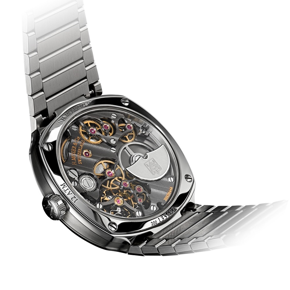 H. モーザーの 18 番目の自社製キャリバーHMC 500が搭載されています。スリムであると同時に高性能なムーブメントにするため、ブランド初のマイクロローターを搭載させました。