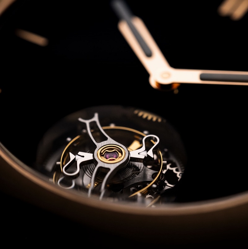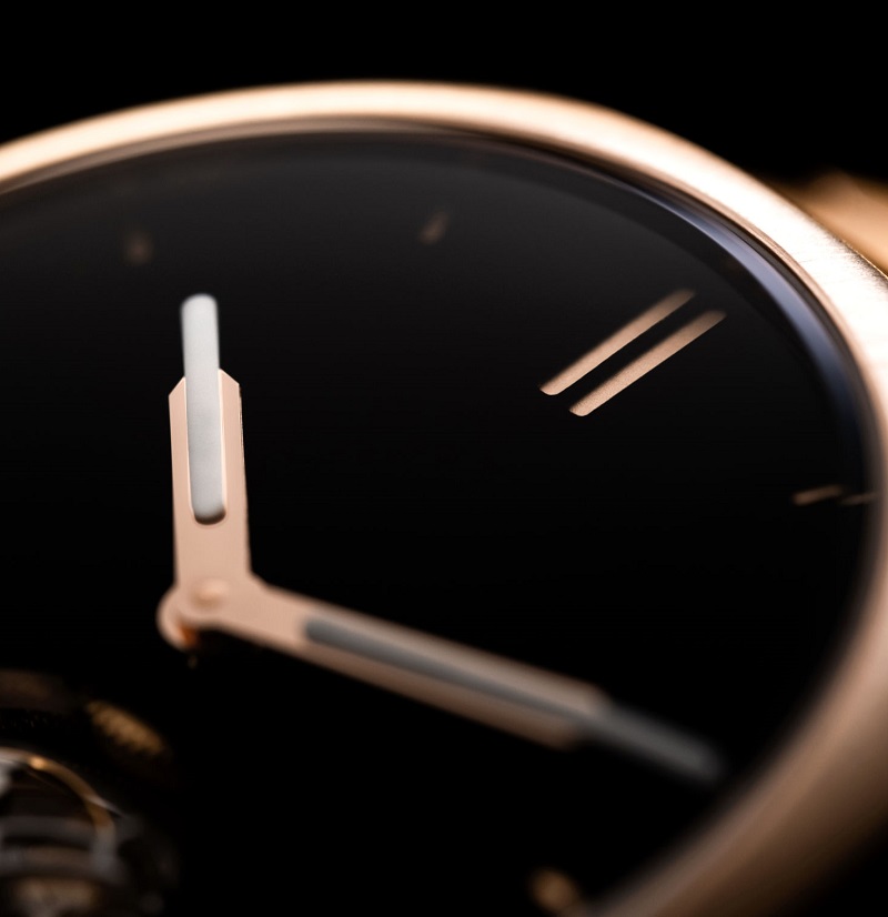 高級時計の伝統的な複雑機構であるトゥールビヨンと、天体物理学や航空産業の分野で用いられる革新的なコーティング素材であるベンタブラック®という組み合わせが、その印象的なコントラストを際立たせています。