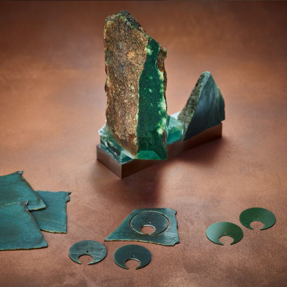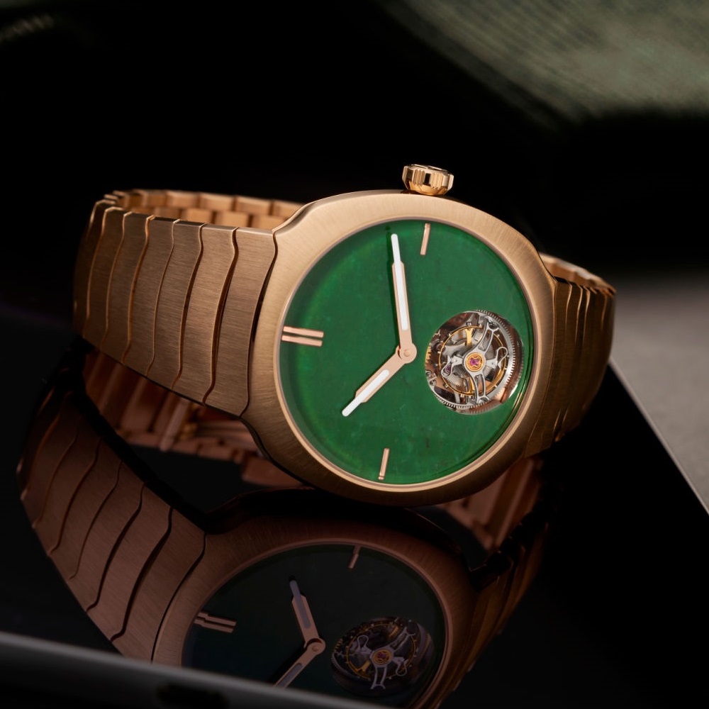 ダイアルにはロゴがなく、3つのインデックスだけで、6 時位置のミニッツ フライング トゥールビヨンとジェード(翡翠)の輝きを存分に堪能できます。
