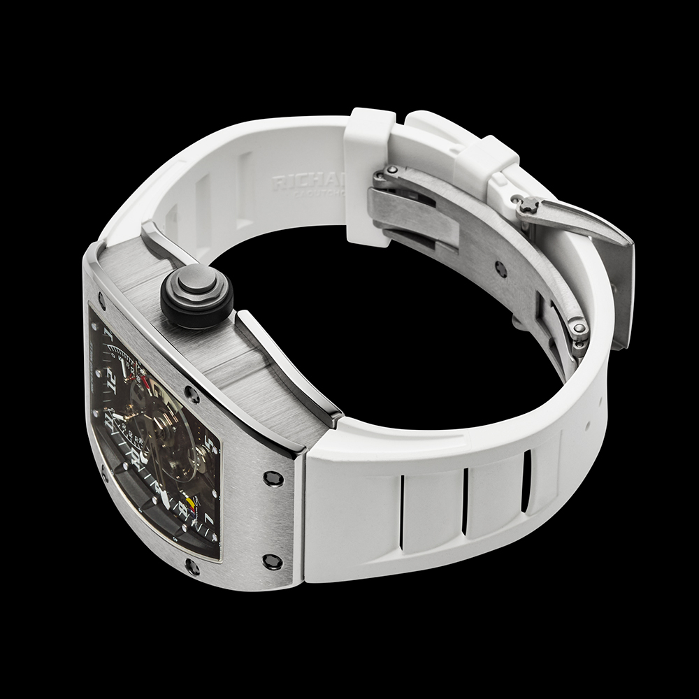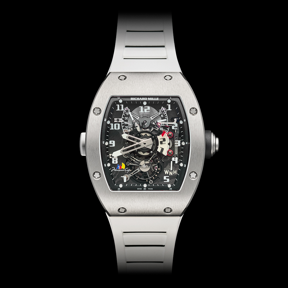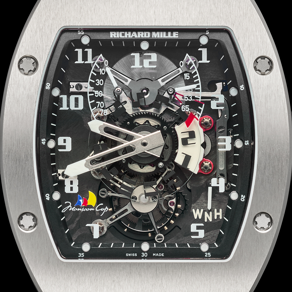 2005年に発表したカーボンファイバー素材をムーブメントに採用したモデル。繊細なトゥールビヨンのブリッジをV字型にすることにより、並外れた耐衝撃性を持っています。デュアルタイム機能も搭載しており、セカンドタイムゾーンの表示は、オプティカルコーティングを施したサファイアクリスタル製のディスクに数字が表示されおり、3時位置の白い背景から時間を確認することができます。4時位置のファンクションインジケーターは、W(巻上げ)、N(ニュートラル)、H(時刻合わせ)のリューズジションを表示します。 MONSOON CUP限定5本。