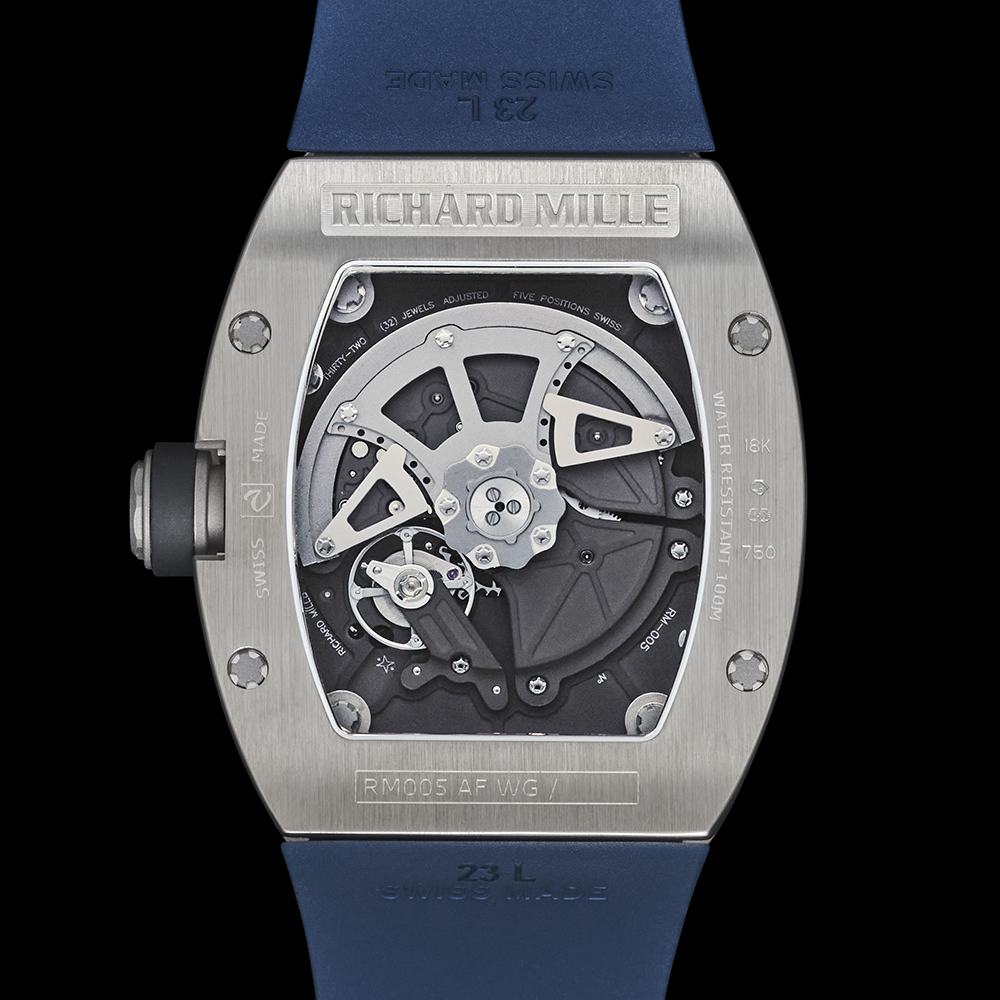 2004年に瞬時に変わるデイト表示を備えた初の自動巻き時計「RM 005」を発表。チタン製の地板の設計や開発に、研究と投資を行いました。ムーブメントの巻き上げ機構を着用者のライフスタイルに合わせて調整出来る可変慣性モーメントローターを初めて搭載したモデルです。