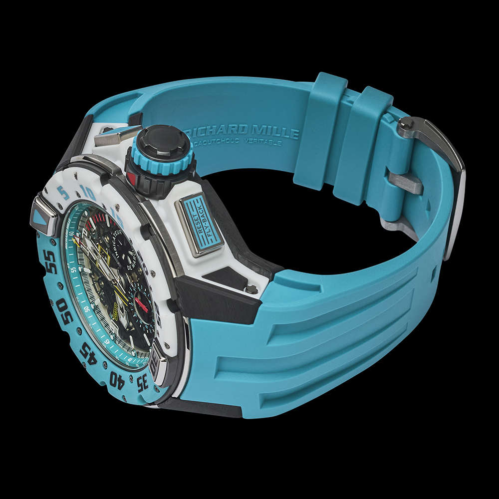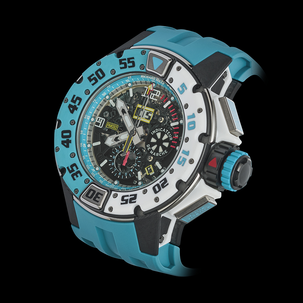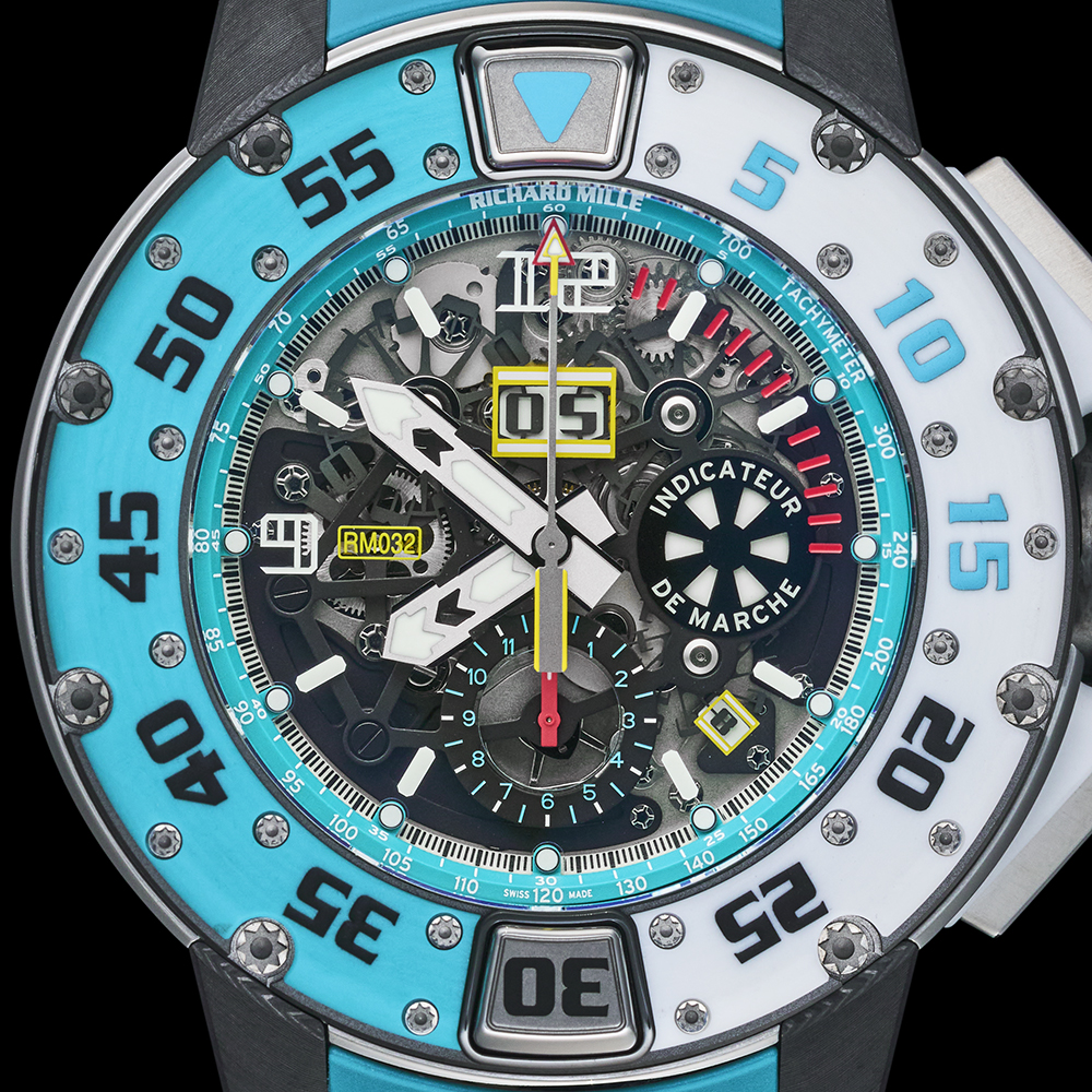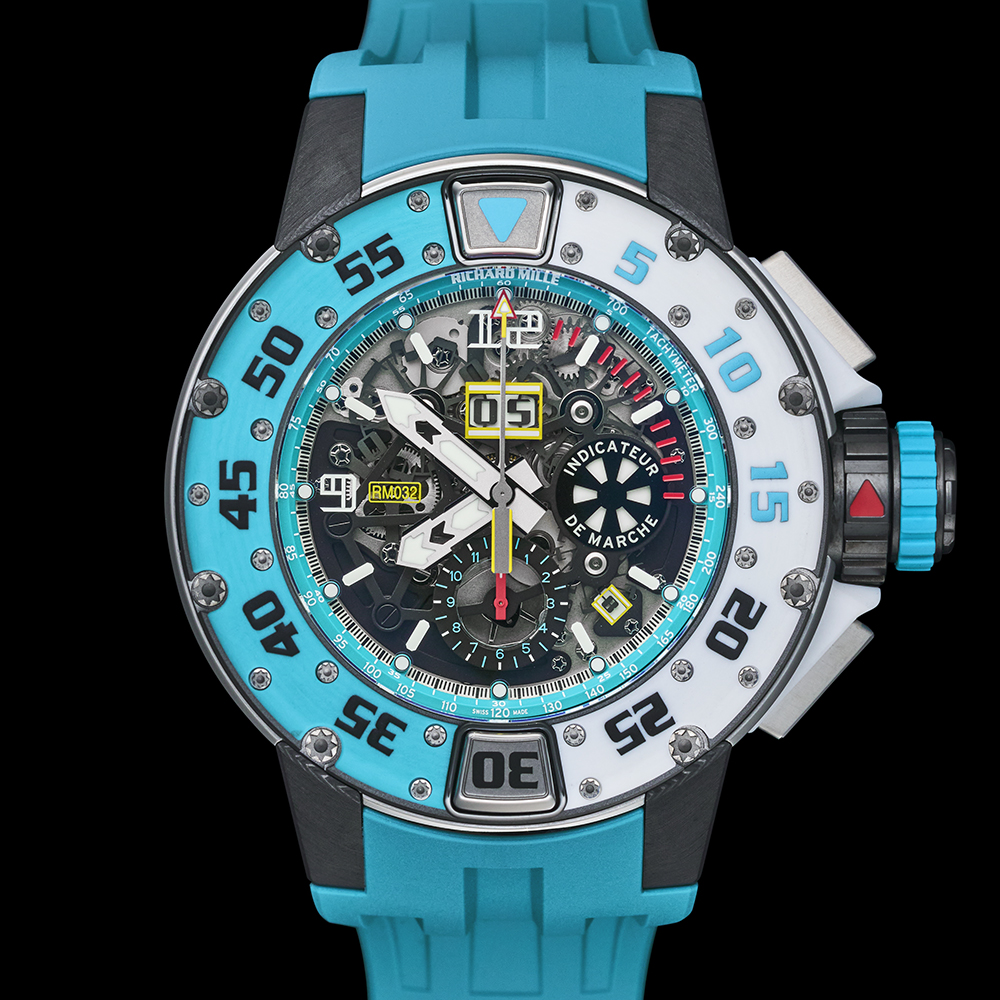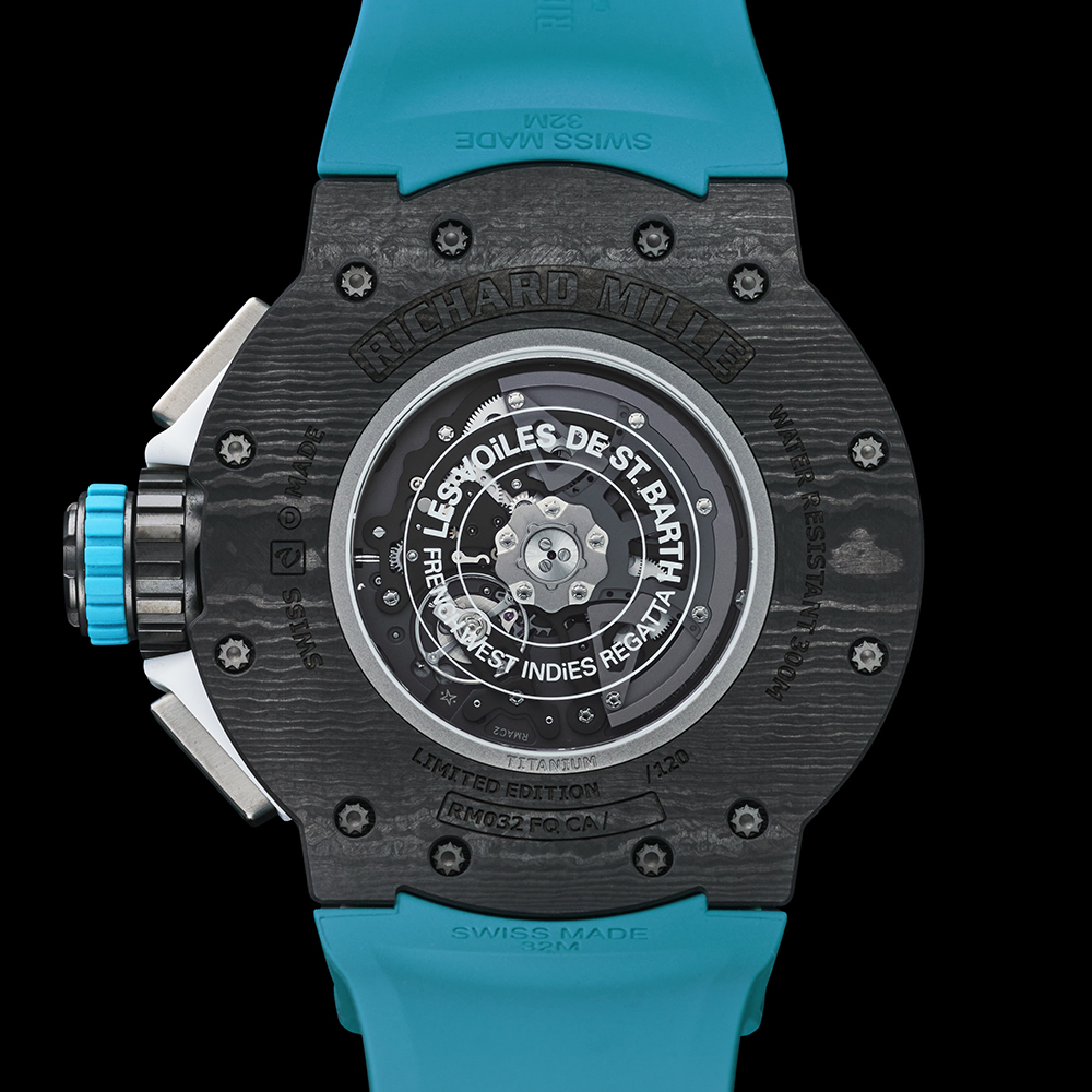 120本限定のRM 032は、カリビアンブルークオーツTPT®とホワイトクオーツTPT®の2色のコンビネーションが特徴的です。防水性と耐久性を絶えず追及した結果、ミドルケースにはグレード5チタンを採用しました。これに対し、ラグと裏蓋はカーボンTPT®製となっています。さらにクロノグラフを操作し、回転ベゼルをロックするためのグレード5チタン製のプッシャーが備えられ、複雑な構造を成しています。裏蓋には、Les Voiles Saint Barth Richard Milleという文字が刻まれています。